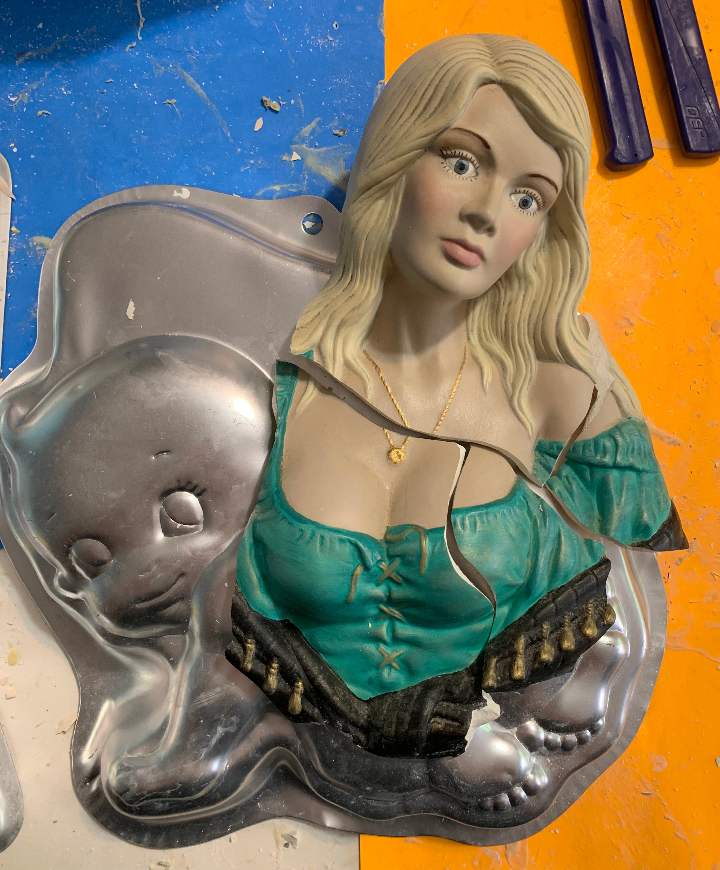 Scott began picking up aluminum character cake pans at yard sales before Covid without any plan. Playing around with concrete casting during the lockdown and the chance breaking of a Wilma Flintstone mug -- used as a pen holder — resulted in the first ceramic and concrete wall hanging sculpture -- and soon after Pop-Smack was born.