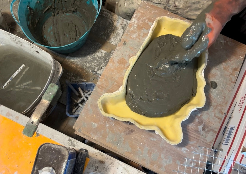 Wet concrete is mixed and poured into the mold to make the Smacker.