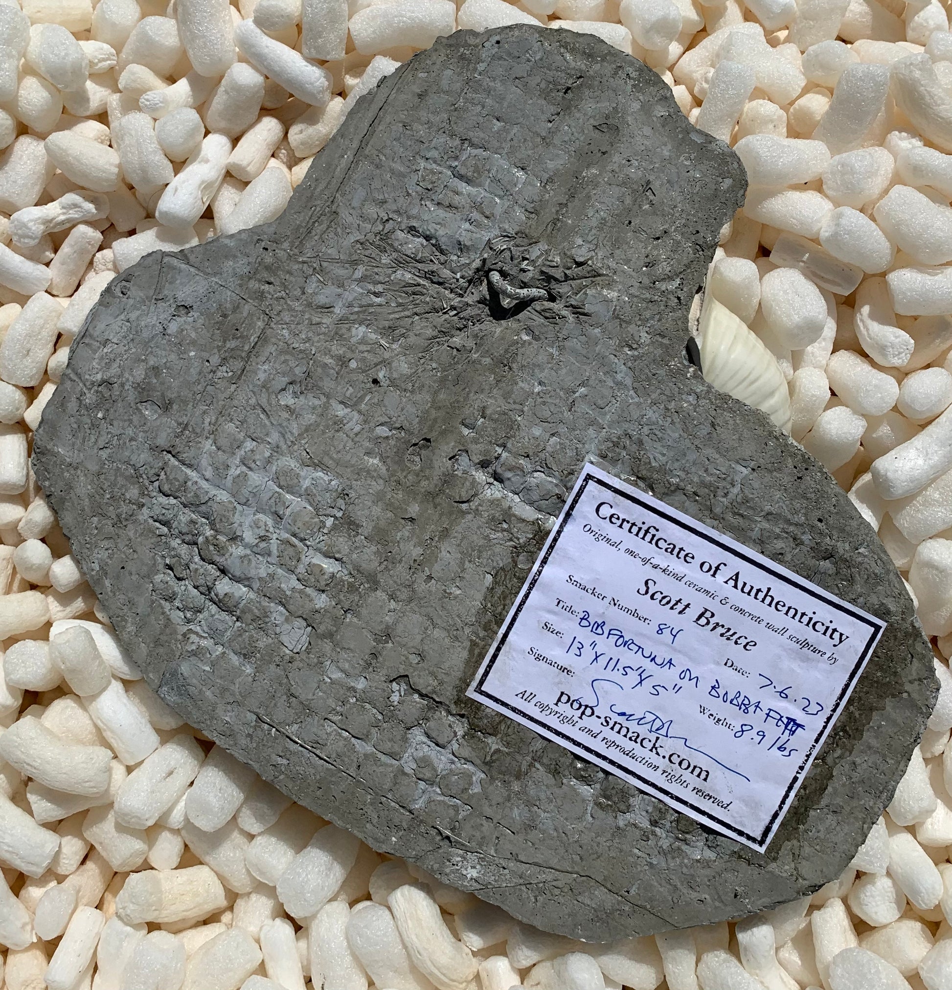 One-off, original Smacker Number 84 from July 2023. Comes with numbered, signed and dated Certificate of Authenticity (COA) glued to the back of the sculpture.