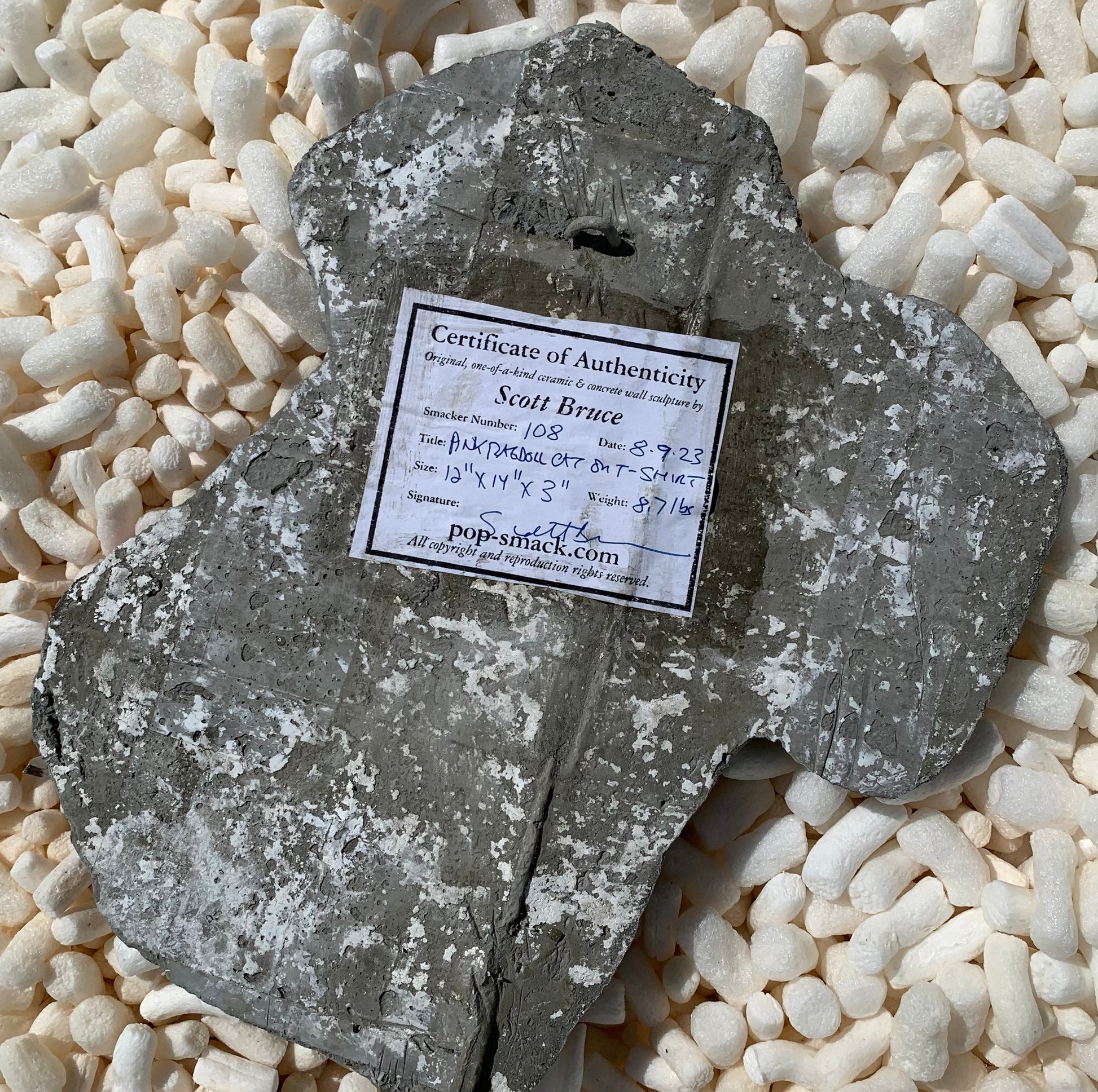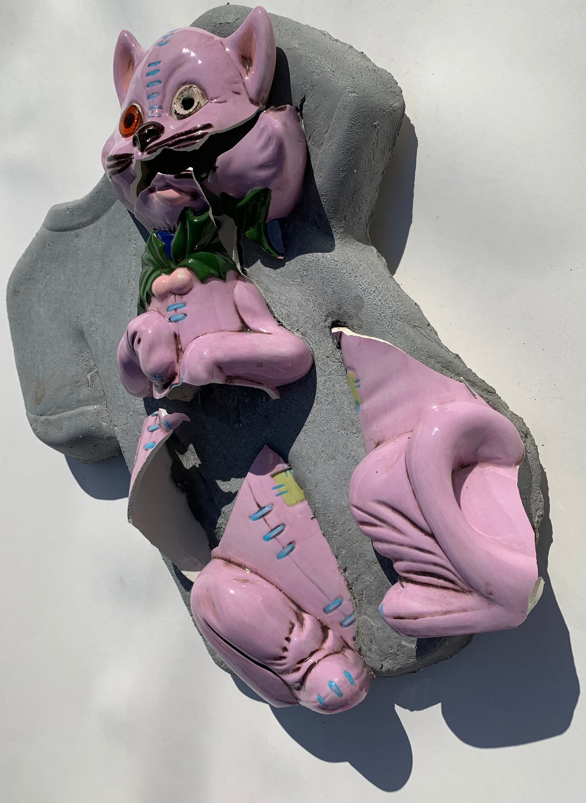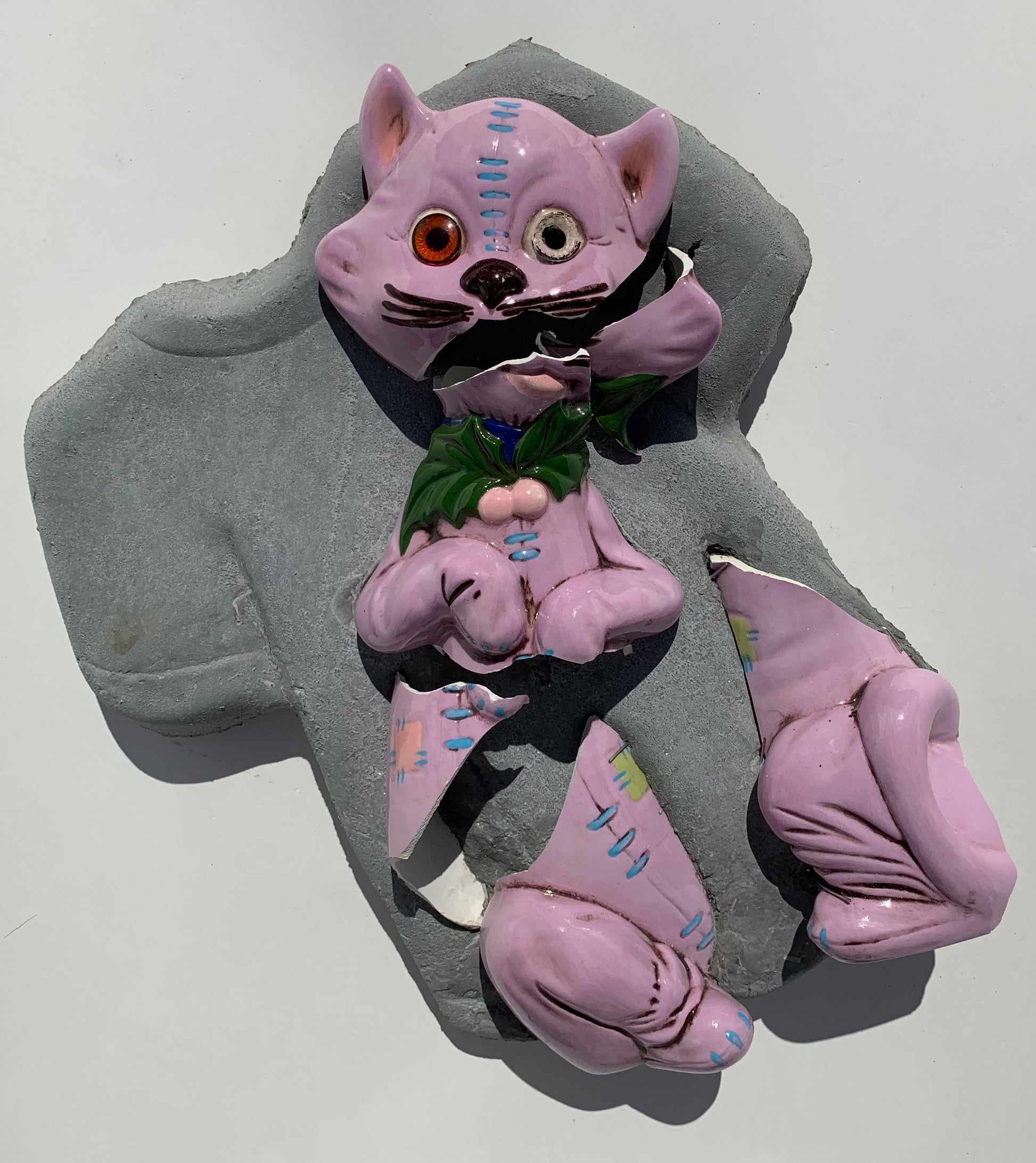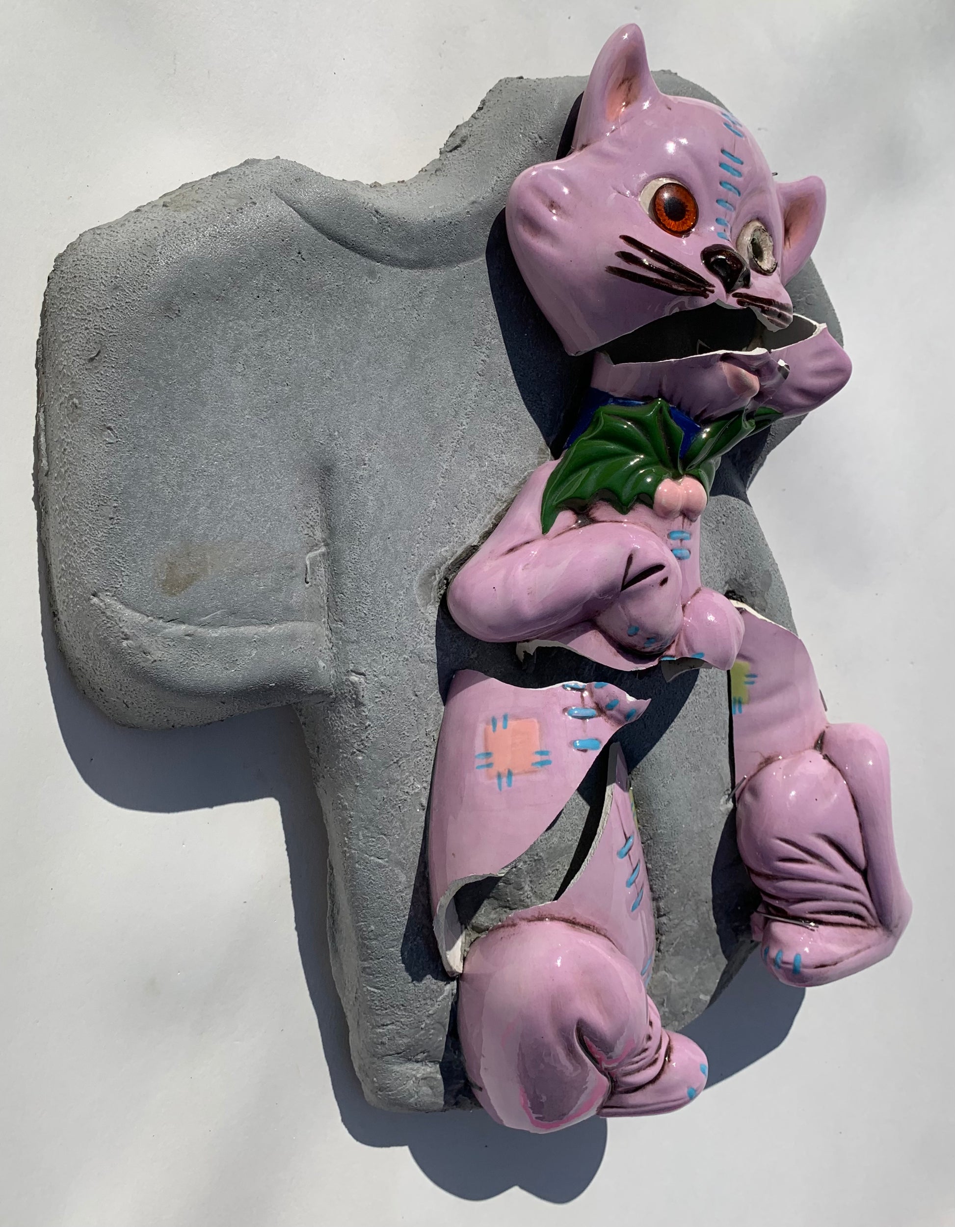 Get Smacked by this Pink Ragdoll Cat on T-Shirt one-off Anthropomorphic Smacker Wall Sculpture entitled "Aghast-A-Cat." Handcrafted in mixed media by artist Scott Bruce.