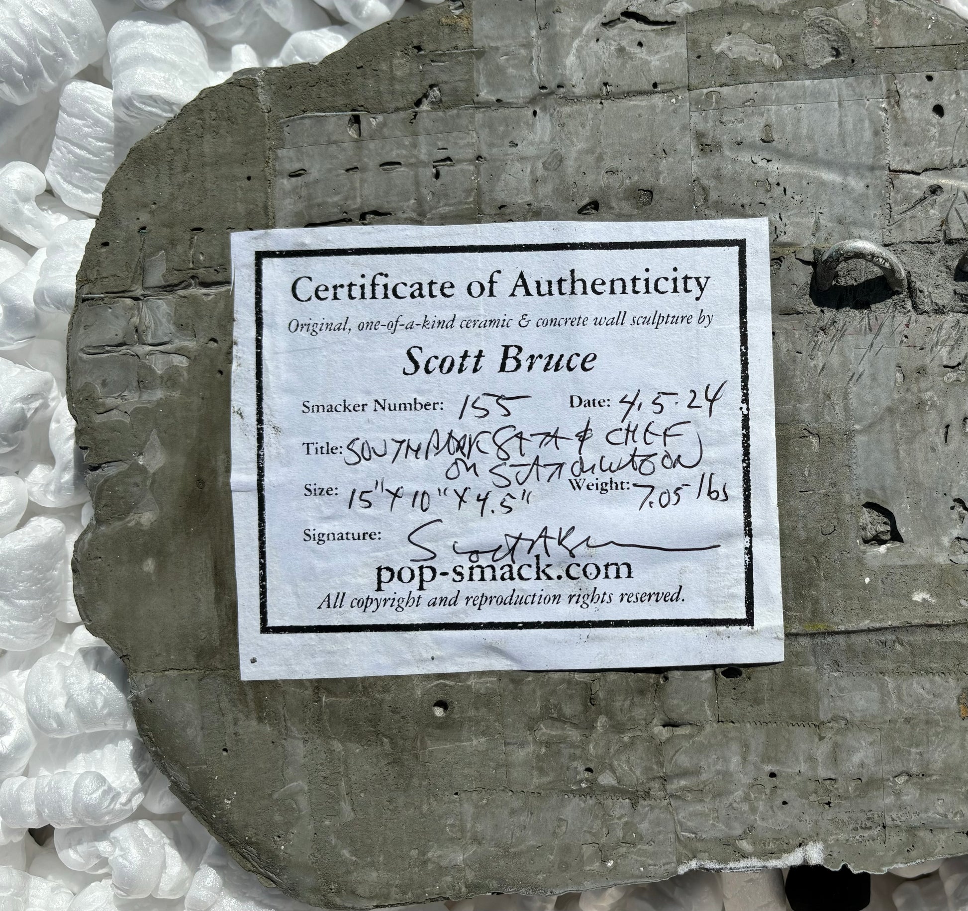 One-off, original Smacker Number 155 from April 2024. Comes with numbered, signed and dated Certificate of Authenticity (COA) glued to the back of the sculpture.