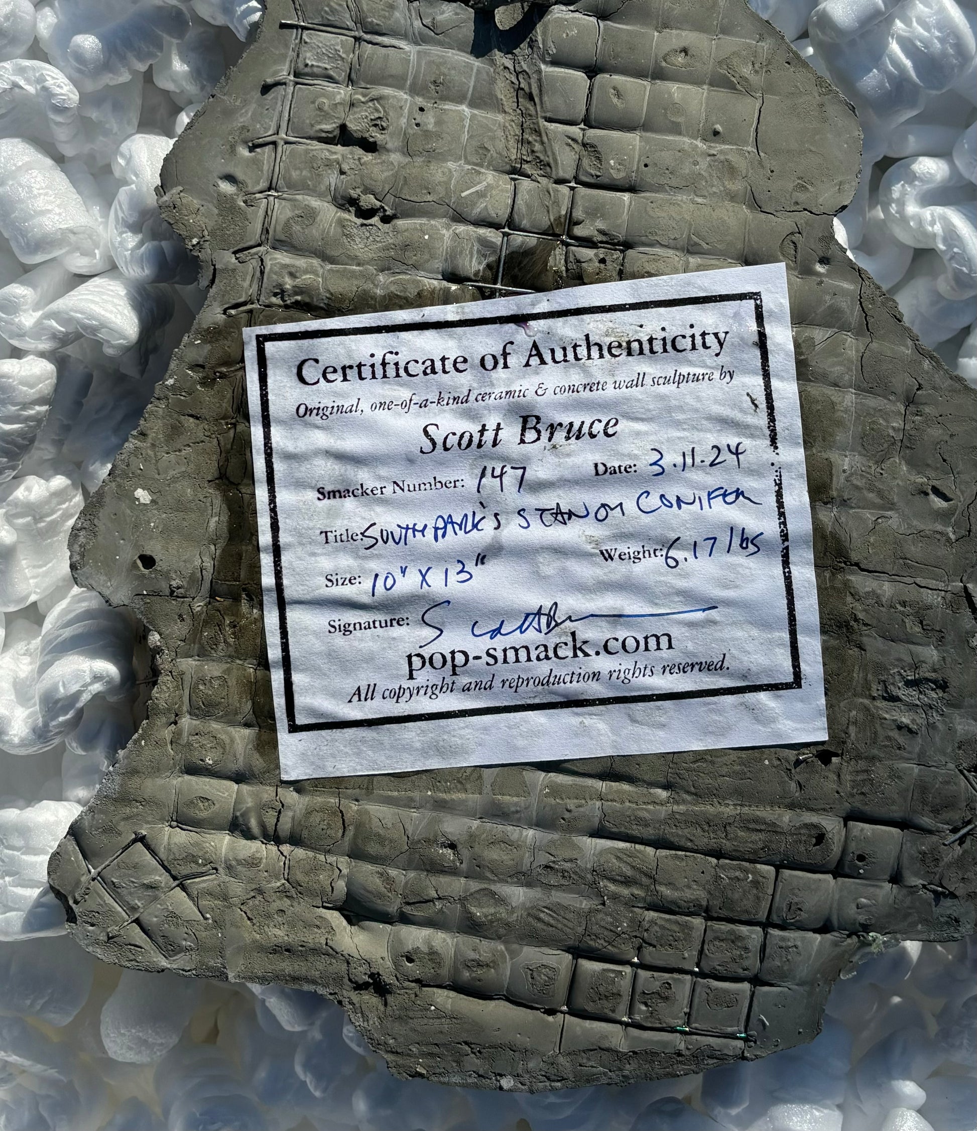 Get Smacked by this South Park's Stan on Conifer Tree one-off Alt Toons ceramic & concrete Smacker Wall Sculpture entitled "Suffering Stan." Handcrafted in mixed media by artist Scott Bruce.